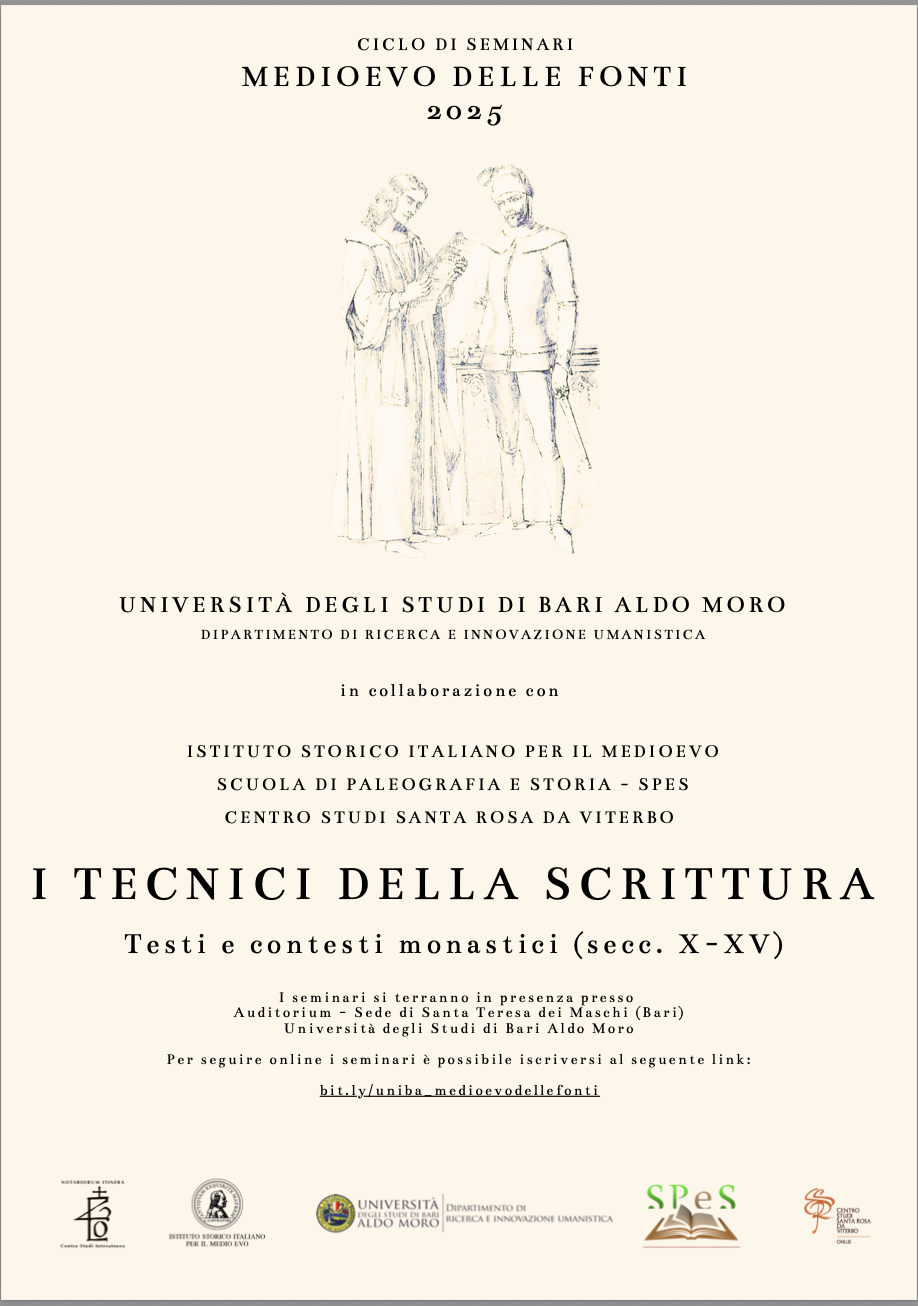 Il 4 novembre avrà inizio il quarto ciclo di seminari Medioevo delle fonti sul tema I tecnici della scrittura: testi e contesti monastici (secc. X-XV), organizzato dalle cattedre di Esegesi delle fonti storiche medievali e di Esegesi del documento medievale del Dipartimento di Ricerca e innovazione umanistica dell’Università degli Studi di Bari Aldo Moro, in collaborazione con il Centro interateneo Notariorum Itinera, la Scuola di Paleografia E Storia del Centro Studi Santa Rosa